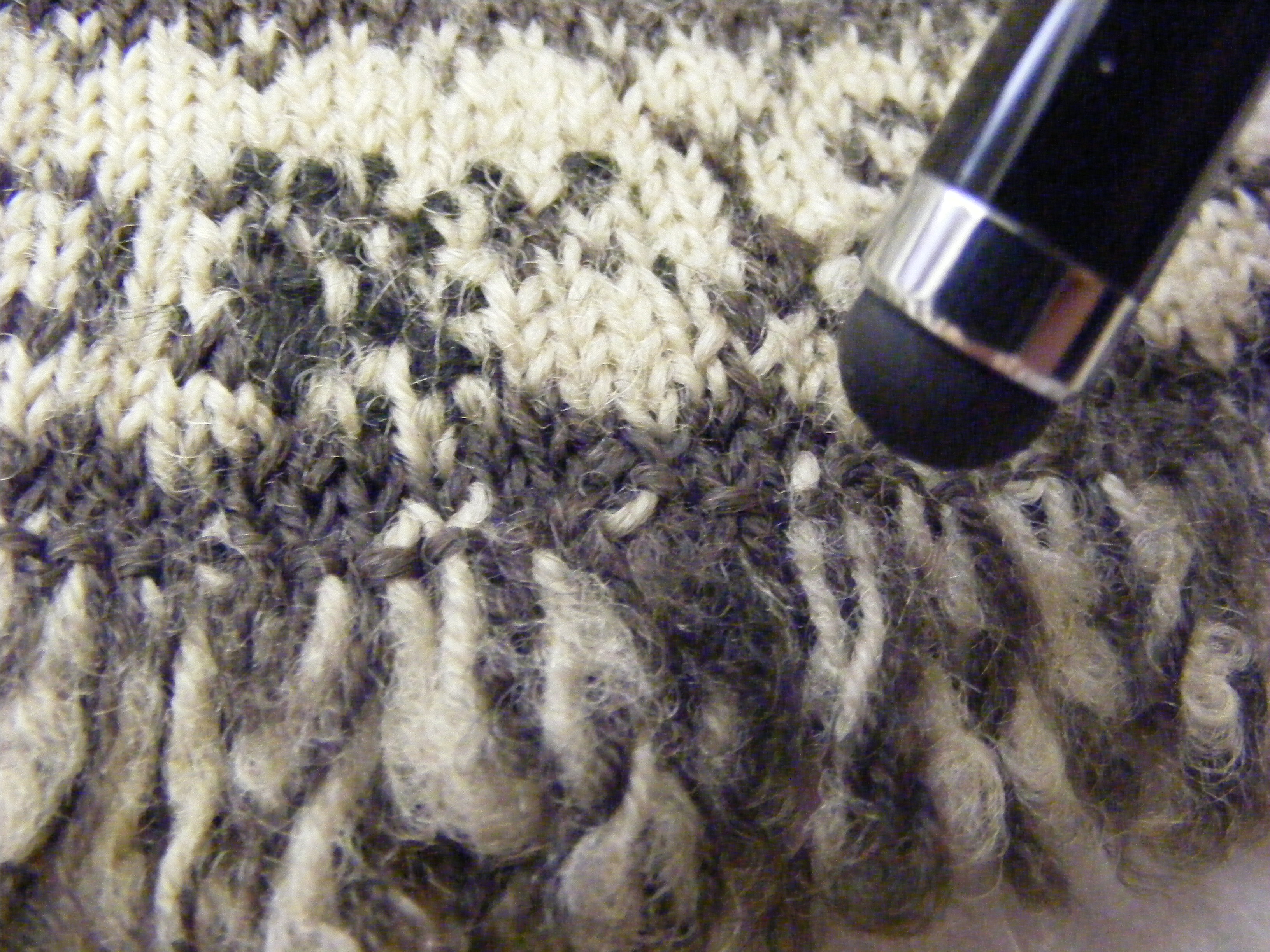 The Yarn Harlot’s Thrum FAQ is pretty well the method I opted for. Only you’ll notice, as in Maine mittens, the Harlot is using unspun wool and the thrums are lying on the inside of the work. For our fringe, we want them on the outside.