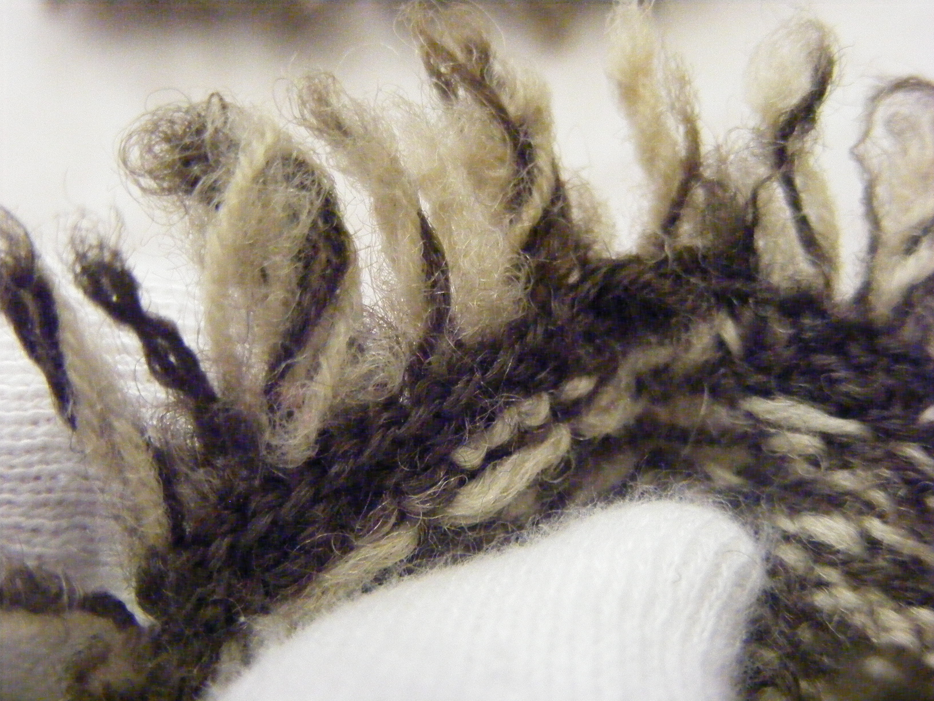 I was lucky to have access to another researcher’s photos of the inside of the hat. I haven’t permission so won’t reproduce the Carleton interior pictures here but what I can show you are our own photos of the G.Walton glove which appears to be thrum-fringed in a similar way. Even so, I am not confident we can say any one way of thrumming is ‘authentic’ for this – or any – period. Which frees you to thrum how works best for you.