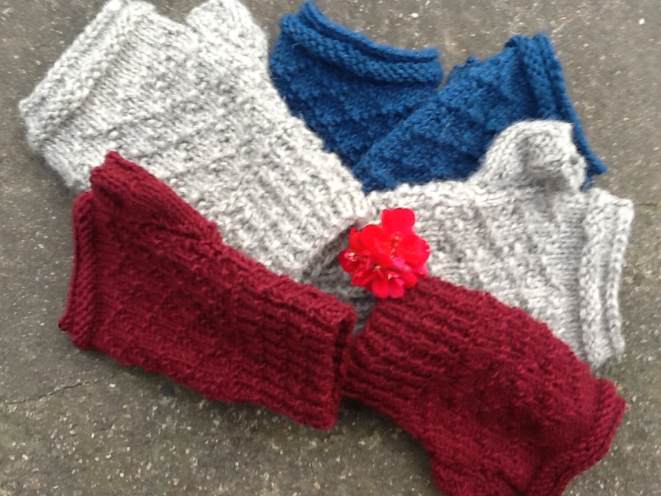 Fingerless mitts using 5 ply guernsey yarn (wine colour and blue) and DK (grey). Using same gansey motif pattern.