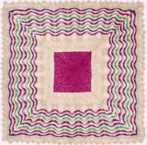 ‘The beauty of this pattern is that all the squares come out truly square. It is knitted on two needles in garter stitch, with decreases at both ends and three other evenly spaced decreases every alternate row.’