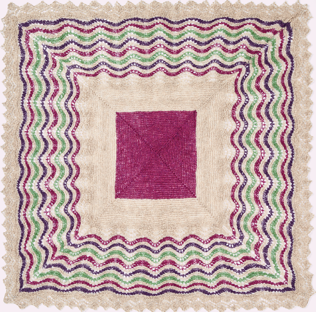 ‘The beauty of this pattern is that all the squares come out truly square. It is knitted on two needles in garter stitch, with decreases at both ends and three other evenly spaced decreases every alternate row.’
